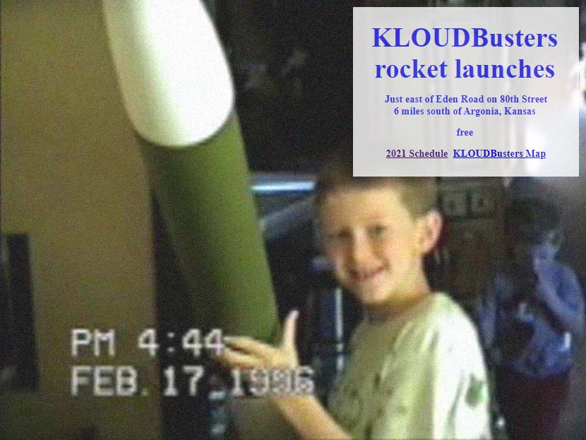 | Several times a year, rocketeers meet to launch high power rockets near Argonia, Kansas, an hour southwest of Wichita. The launches take place at the 40 acre KLOUDBusters launch site surrounded by wheat fields. The site has a standing permit for launches up to 25,000 feet and can get waivers for rockets traveling even higher.